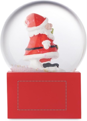 Kleine weihnachtliche Schneekugel aus Glas mit Sockel aus Polyresin.