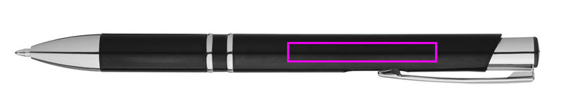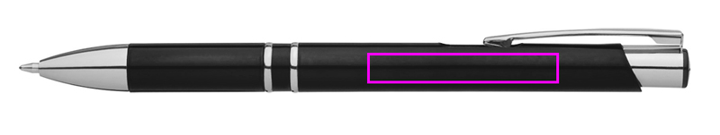 Kunststoff-Kugelschreiber mit blauschreibender Kunststoff-Mine und silbernen Applikationen. Ihre Werbung wird unterhalb des Clips aufgedruckt.