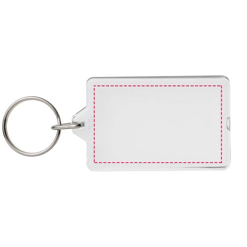 Transparenter, rechteckiger G1-Schlüsselanhänger mit metallenem Schlüsselring. Dieser Schlüsselanhänger kann mit einer Münze wieder geöffnet werden. Der Metallring bietet ein flaches Profil, das sich ideal für Mailings eignet. Abmessungen der Druckeinlage: 5,0 cm x 3,0 cm.