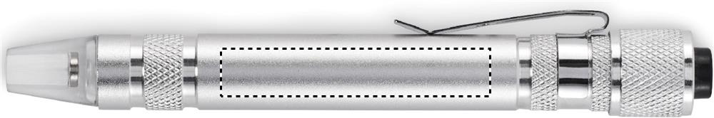 Multitool in Form eines Stiftes aus recyceltem Aluminium. Inkl. 3 Schlitz- und 3 Phillips-Schraubendreherköpfen und Taschenlampe. Inkl. 4 Knopfzellen LR41.