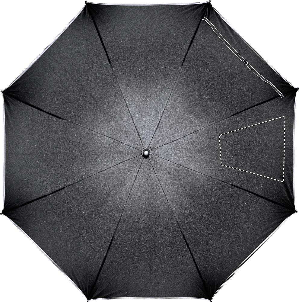 23'' Regenschirm aus 190T Seide. Windbeständig. Stock und Schienen aus Fiberglas, Spitzen aus schwarzem Kunststoff. Schwarze Segmente mit farblich passenden Nähten. Griff aus Kunststoff. Automatische Öffnung, manuelle Schließung.