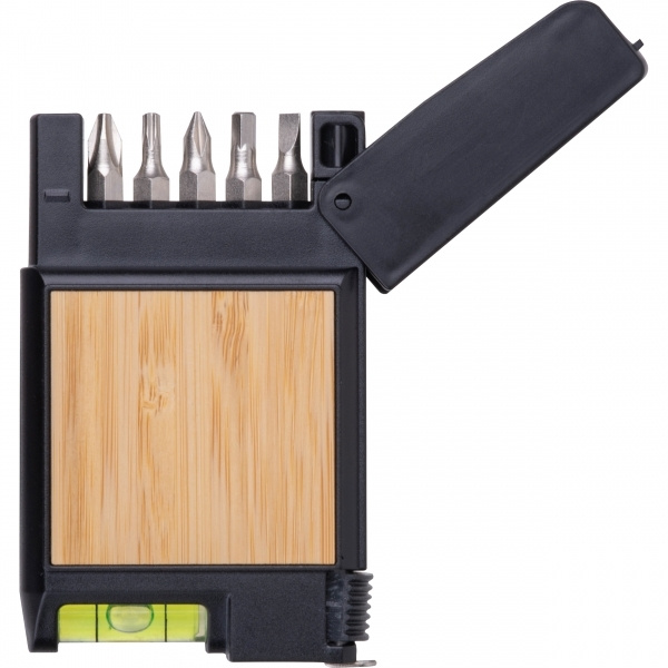 3-meter tape measure made of plastic with a spirit level, locking button, and five different bits. Your logo is applied to the bamboo inlay.