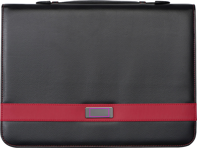 A4 writing case with finest Bonded Leather (leather fiber fabric), various rubber loops and slip pockets, ring binder insert, writing pad (60 pages), tablet / smartphone holder, cell phone pocket, carry handle and zipper closure. Your logo will be laser engraved on the outside of the metal plate.