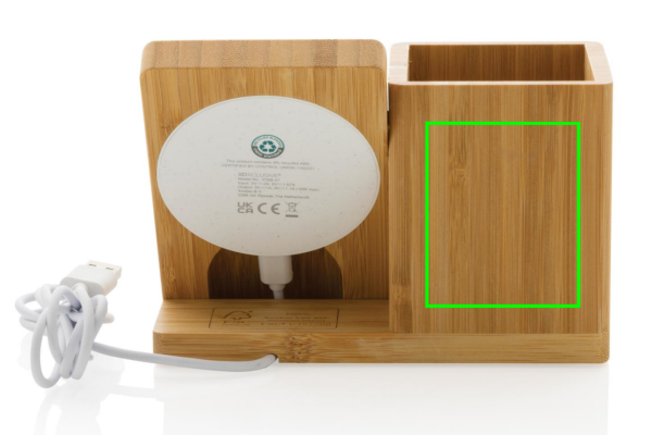 10W wireless fast charger with pen holder made with RCS (Recycled Claim Standard) certified recycled ABS. Total recycled content: 6% based on total item weight (including bamboo base) The bamboo exterior of the organiser is fully made from FSC 100 bamboo. Including 120 cm type C charging cable made from RCS certified recycled TPE. Packed in FSC mix kraft box. Type-C Input 5V/2A; 9V/1.67A. Wireless output 5V/1A;9V/1.1A (10W) Registered design®