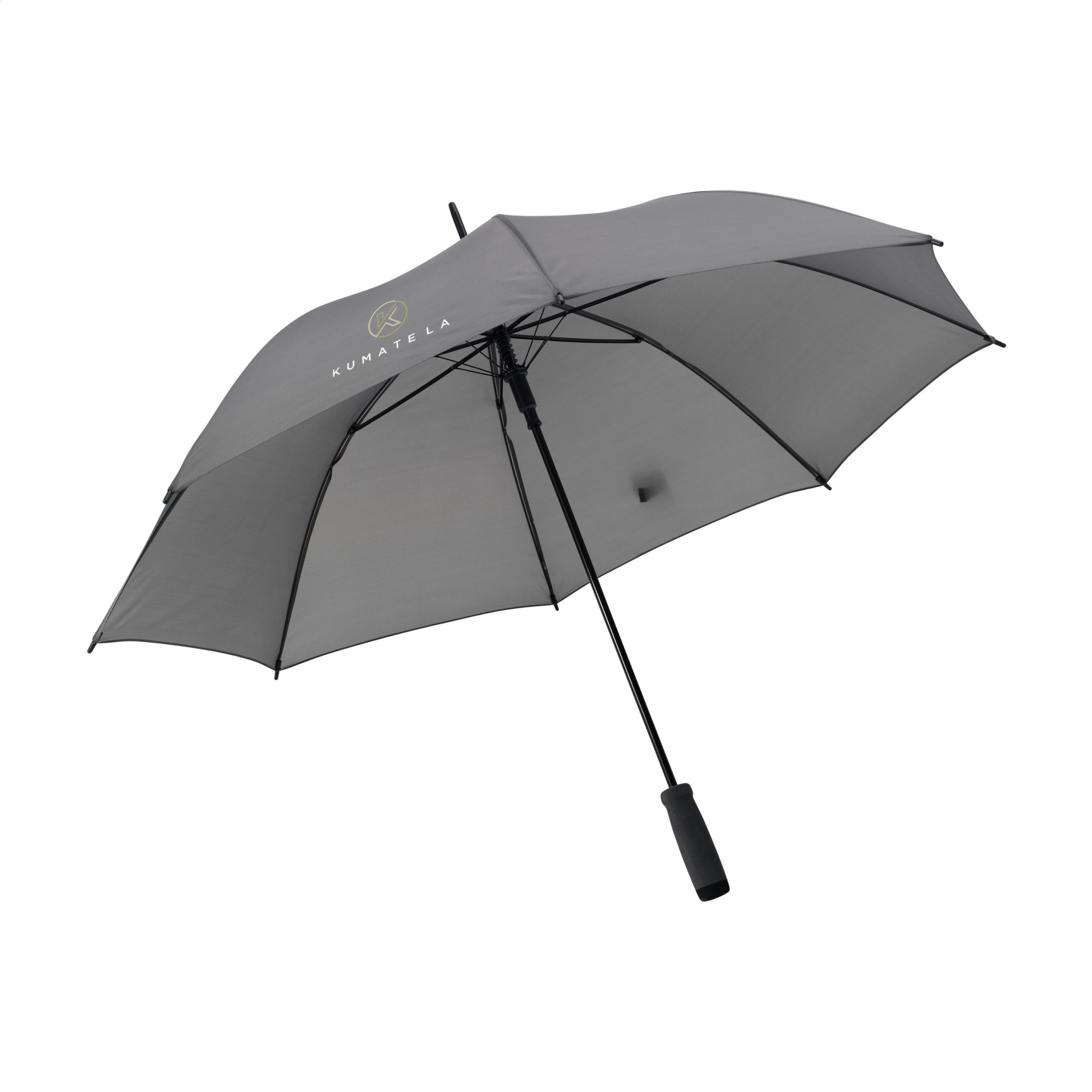 Umbrella with automatic telescopic springs. Features a 190T polyester canopy, fibreglass frame, metal shaft, soft foam handle and Velcro closure.