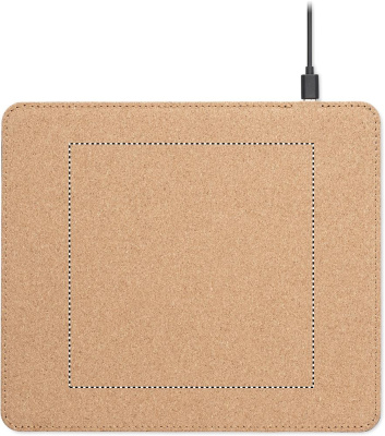 Cork mouse mat with 15W wireless charger. Output: DC 9V/1.6A. Compatible with latest Androids, iPhone® 8 and newer. Size 23cm x20cm. Cork is 100% natural material. Due to its structural nature and surface porosity the final print result per item may have deviations.
