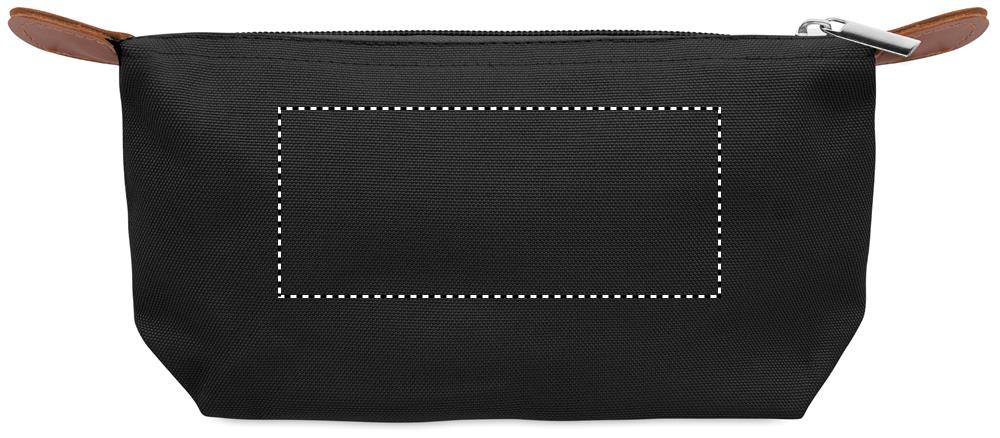 Cosmetic bag made of 600D RPET polyester with top zip closure and brown PU detail.