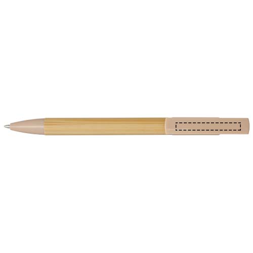 Bamboo ballpoint pen that also functions as a phone holder. The button and mid ring are made of recycled plastic, the tip is made of brass, and the barrel is made of responsibly sourced bamboo. Ink colour: Blue. Writing length: 1000 metres. Nib size: 1.0 mm.