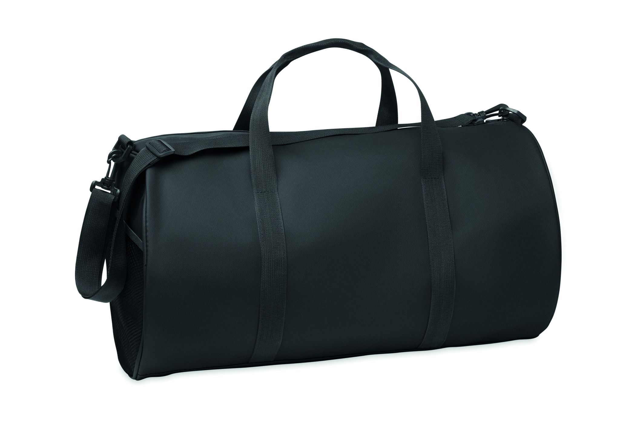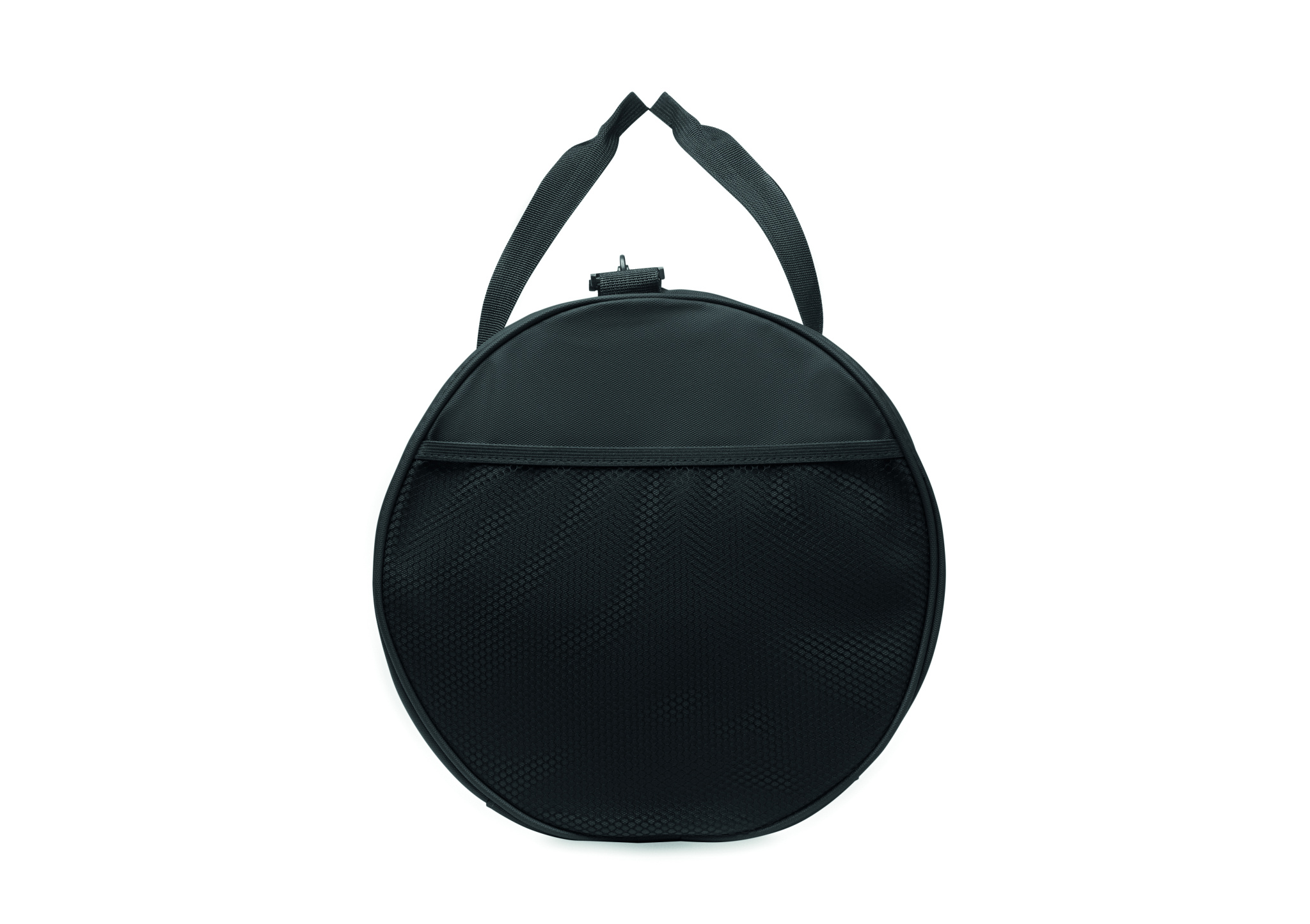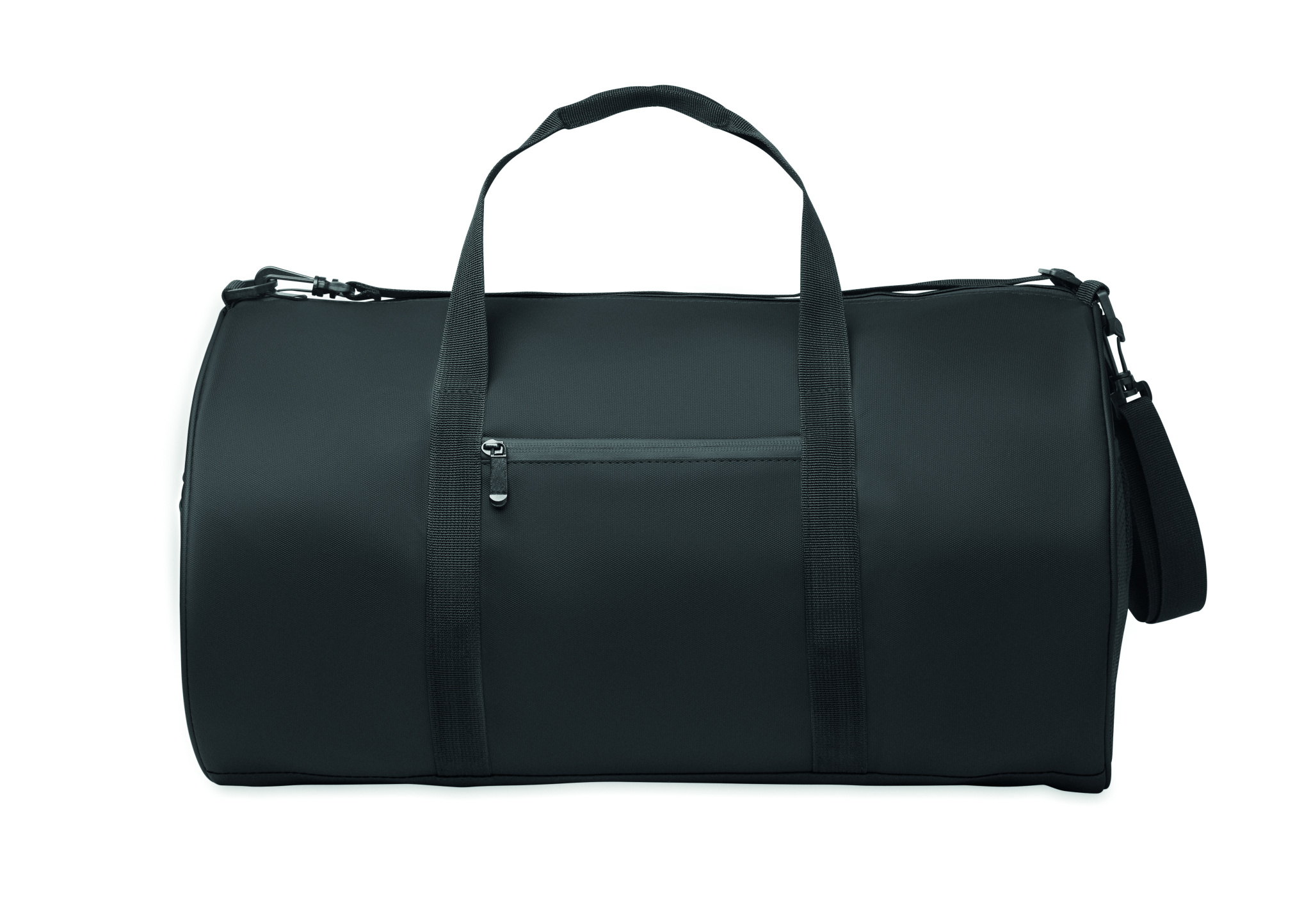 Duffle bag in 600D RPET polyester with PU coating. Front zippered pocket. Inside 210D RPET polyester lining. 1 side zippered compartment / 1 side mesh compartment. Zippered pocket inside.