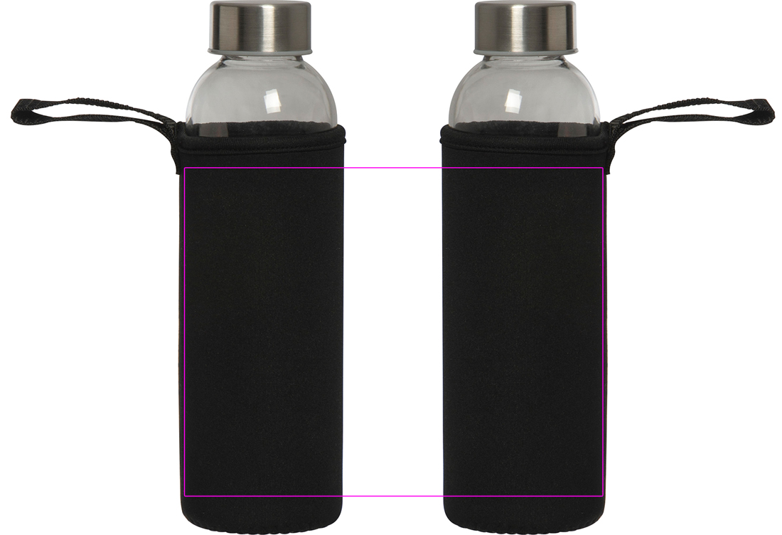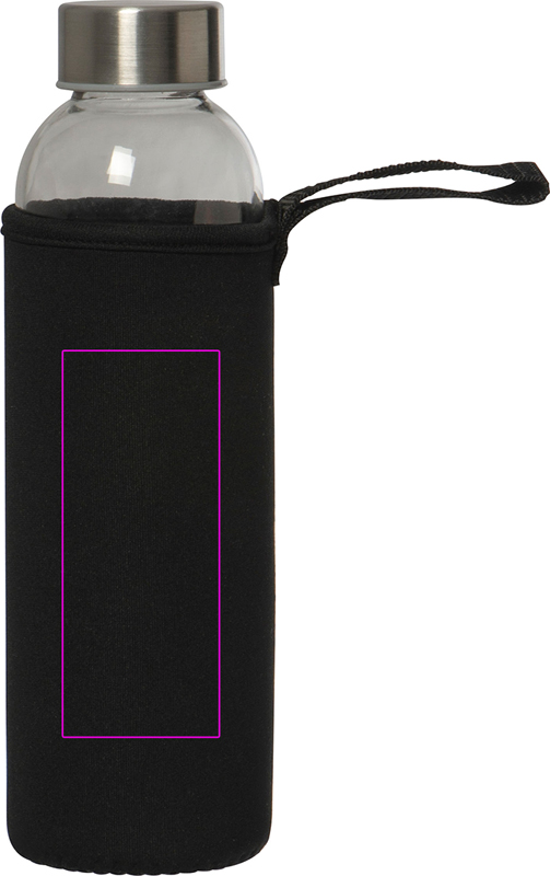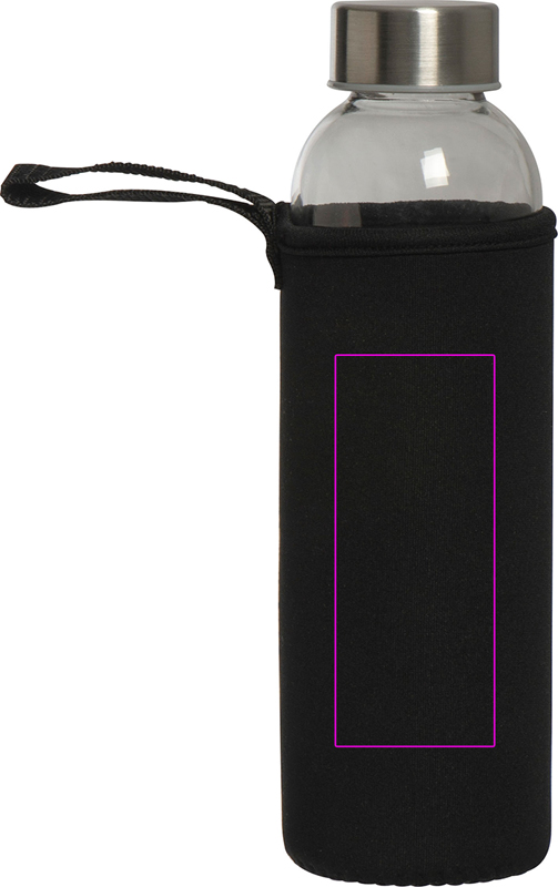 Leak-proof drinking bottle made of glass with stainless steel lid and a capacity of 500 ml. The bottle is delivered in a matching neoprene sleeve with carrying strap. We print your logo in the center of the sleeve. Engraving on the lid or bottle and printing on the bottle possible on request.