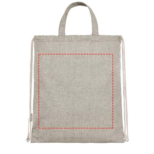 Drawstring bag made of a 150 g/m² recycled cotton polyester blend. Large main compartment with cotton drawstring closure in natural colour. Recycled cotton is manufactured from pre-consumer waste generated by textile factories during the cutting process. Similar colours are blended together so no additional dyeing is required. Due to the nature of recycled cotton, there may be a very slight colour variation. This distinctly adds to a more authentic appearance. Each backpack also comes with an Aware™ tracer. This innovative feature allows users to trace the origins and journey of their item through a QR code, enhancing transparency in the supply chain and fostering a stronger connection between the product and its production process. Resistance up to 5 kg weight. Handle length: 14 cm.