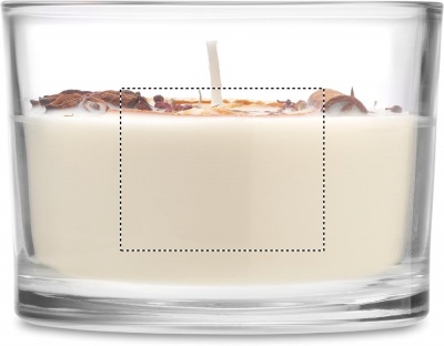 Cinnamon and citrus fragranced plant based wax candle with dried flowers and fruits in glass jar holder. 300 gr. Burn time: 50 hours.