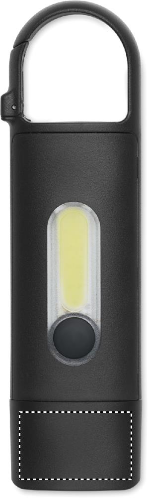 Pocket-size Rechargeable COB flash light with carabiner hook in ABS. Emergency light and 3 lighting modes. 1 × 3.7V, 200 mAh Lithium rechargeable battery (included, non-replaceable).