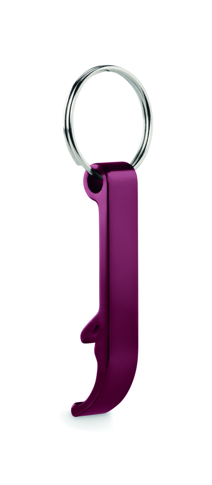 Recycled aluminium key ring bottle opener in shiny finish.