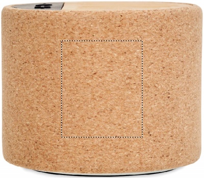 5.3 wireless speaker in ABS with cork casing with bamboo on top and LED light indication. 1 Rechargeable Lithium 300 mAh battery included. Output data: 3W, 4 Ohm and 5V. Playing time approx.. 4h. Cork is 100% natural material. Due to its structural nature and surface porosity the final print result per item may have deviations.