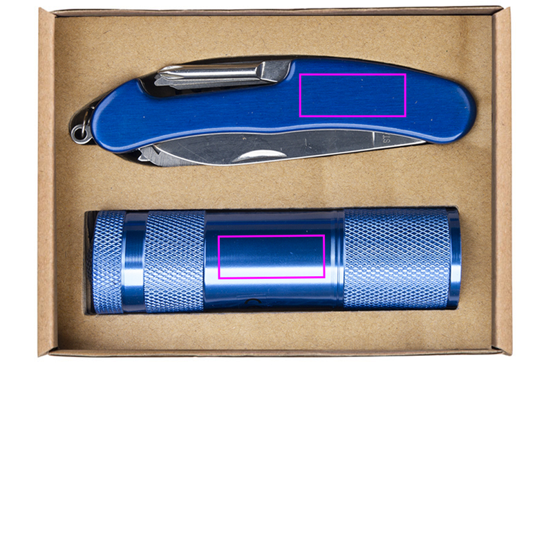 Set consisting of an aluminum flashlight with nine LEDs and a pocket knife. We laser your logo on the flashlight and the pocket knife in the same size. Three AAA batteries included.
