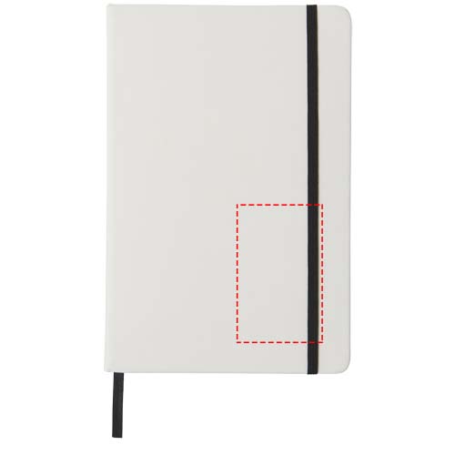 White A5 notebook with coloured elastic closure and ribbon. Includes 80 sheets (60g/m2) lined paper. Digital print possible on cover.