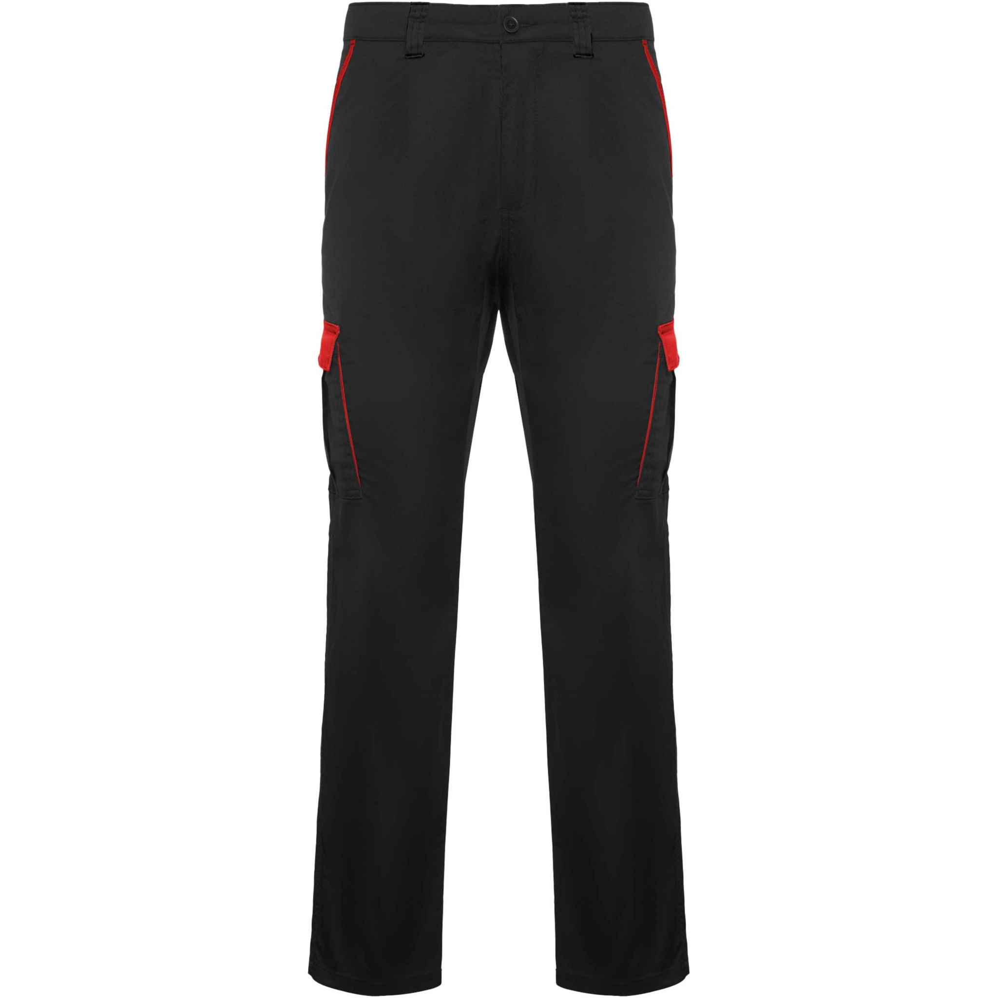 Long workwear trousers in a colour combination design. Comfortable and adjustable fabric. Back elastic waistband. Contrasting belt loops, flaps, pleats and trims. Two front pockets. Two pleated side pockets with flap and hook & loop fastening. Two back pockets with flap and hook & loop fastening.