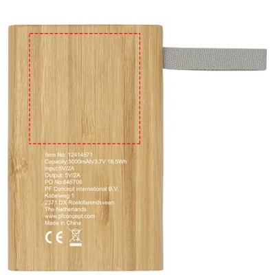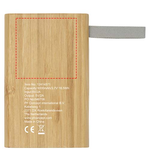 Bamboo power bank that provides 5000 mAh of back-up power for mobile phones or other digital devices. It features LED indicator lights and a webbing made of RPET material. Packaged in a gift box and delivered with an instruction manual (both made of sustainable material). Micro-USB charging cable is included. Since bamboo is a natural product, there may be slight variations in colour and size per item, which may affect the final decoration outcome.