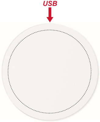 Wireless charger. Connect device to your computer, place smartphone on device to commence charging. Output: DC5V/1A (5W). Compatible latest androids, iPhone® 8, X and newer. Ideal for full colour personalisation.