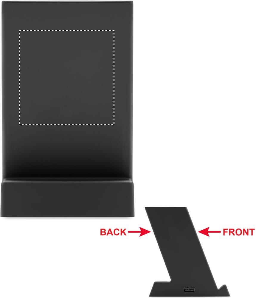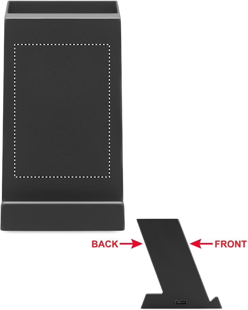 15W dual coil wireless charger with pen holder in ABS. Output: DC 9V/1.67A (15W) for quick charging. 1 USB-A port power output. Compatible with latest Androids, iPhone® 8, X and newer.
