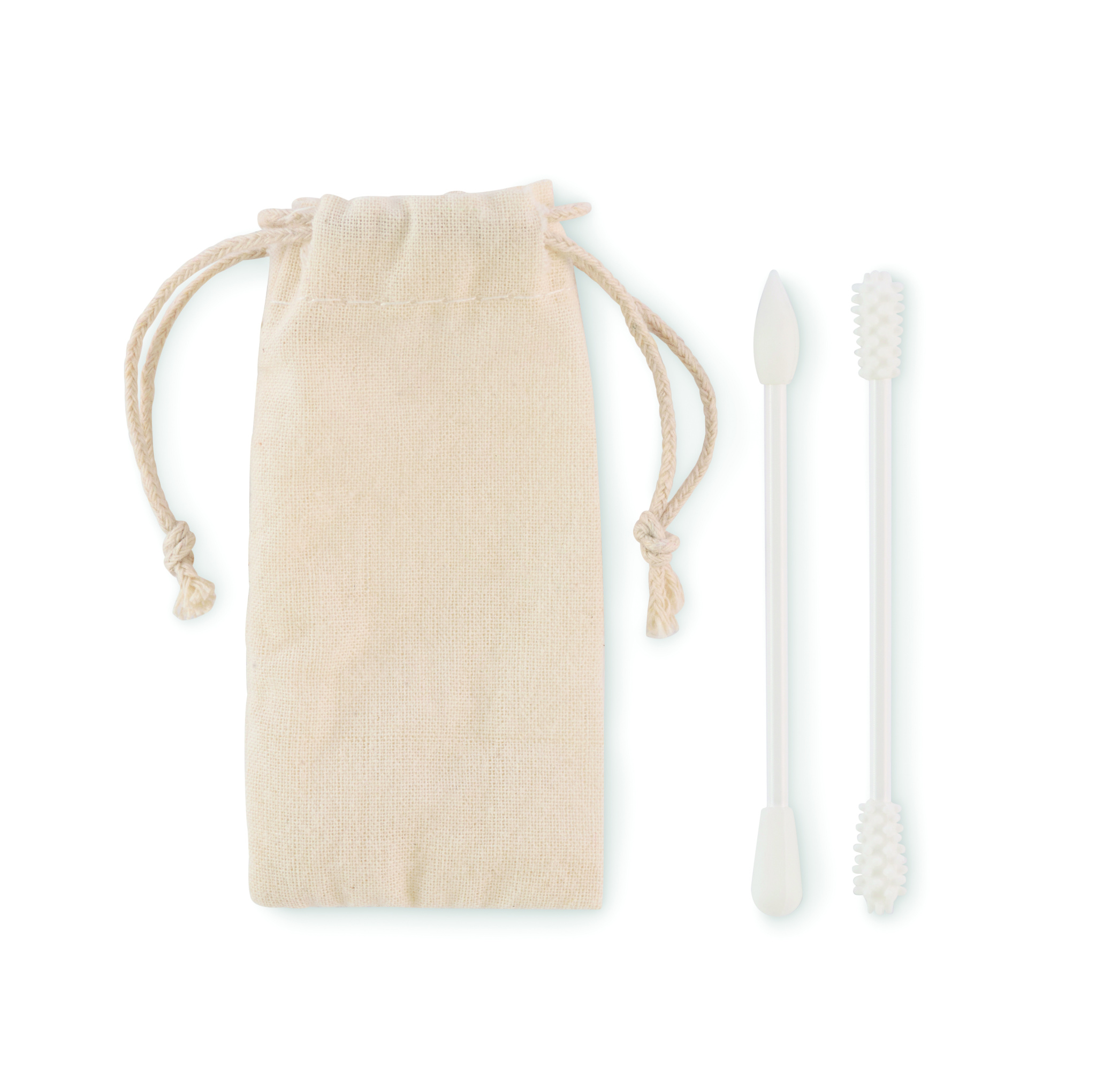 Komplektis 2 korduvkasutatavat ja pestavat silikoonist kõrvatikku 3 erineva peaga. Nööriga puuvillases kotis.
