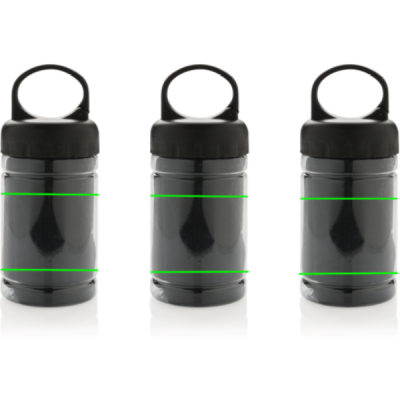 Mikrokiust jahutusrätik 100% kemikaalidevaba. 98% päikesekaitse funktsioon kuni UV 50+ kaitseni. Rätikut saab hõlpsasti kasutada, lisades pudelisse veidi külma vett, luues jaheda rätiku kiireks värskendamiseks. Pudel on valmistatud PP-st, millel on ABS pealispind ja karabiin, mida saab õuetegevustes kaasa võtta. 77x30 cm.