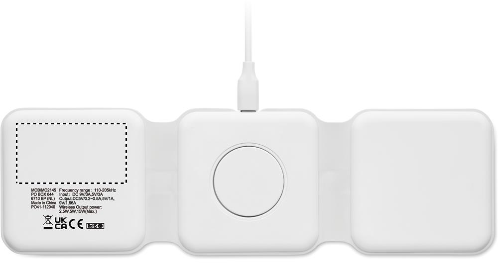 Kolm-ühes kokkupandav ABS-laadimisjaam. Sellel on 3 juhtmevaba laadimiskohta (15 W). Sisend: 2-in-1 Type-C ja Type-A. Ühildub kõigi QI-toega seadmetega, nagu uusimad Androidid, iPhone® 8, X ja uuemad. Ühildub ka iWatchiga.