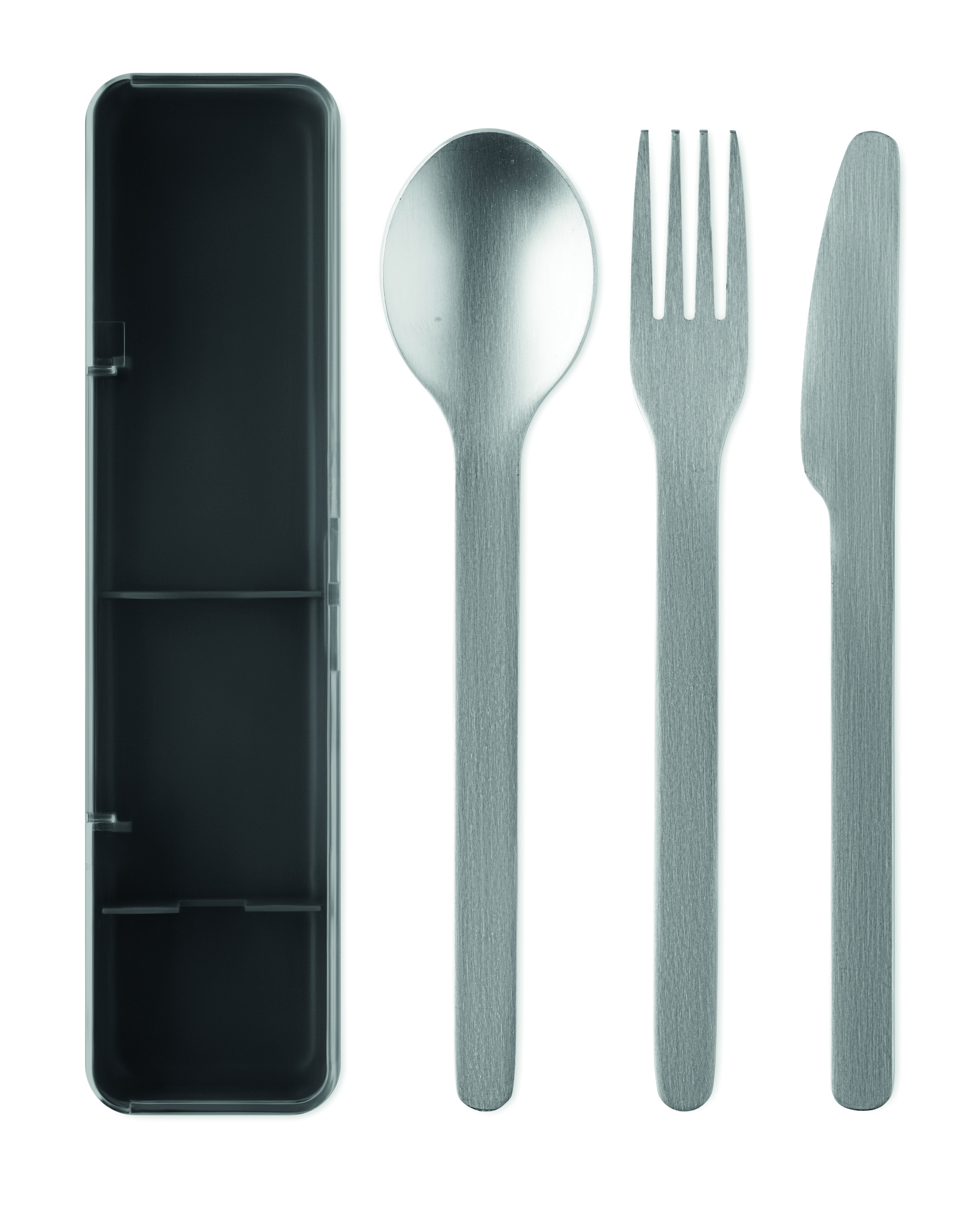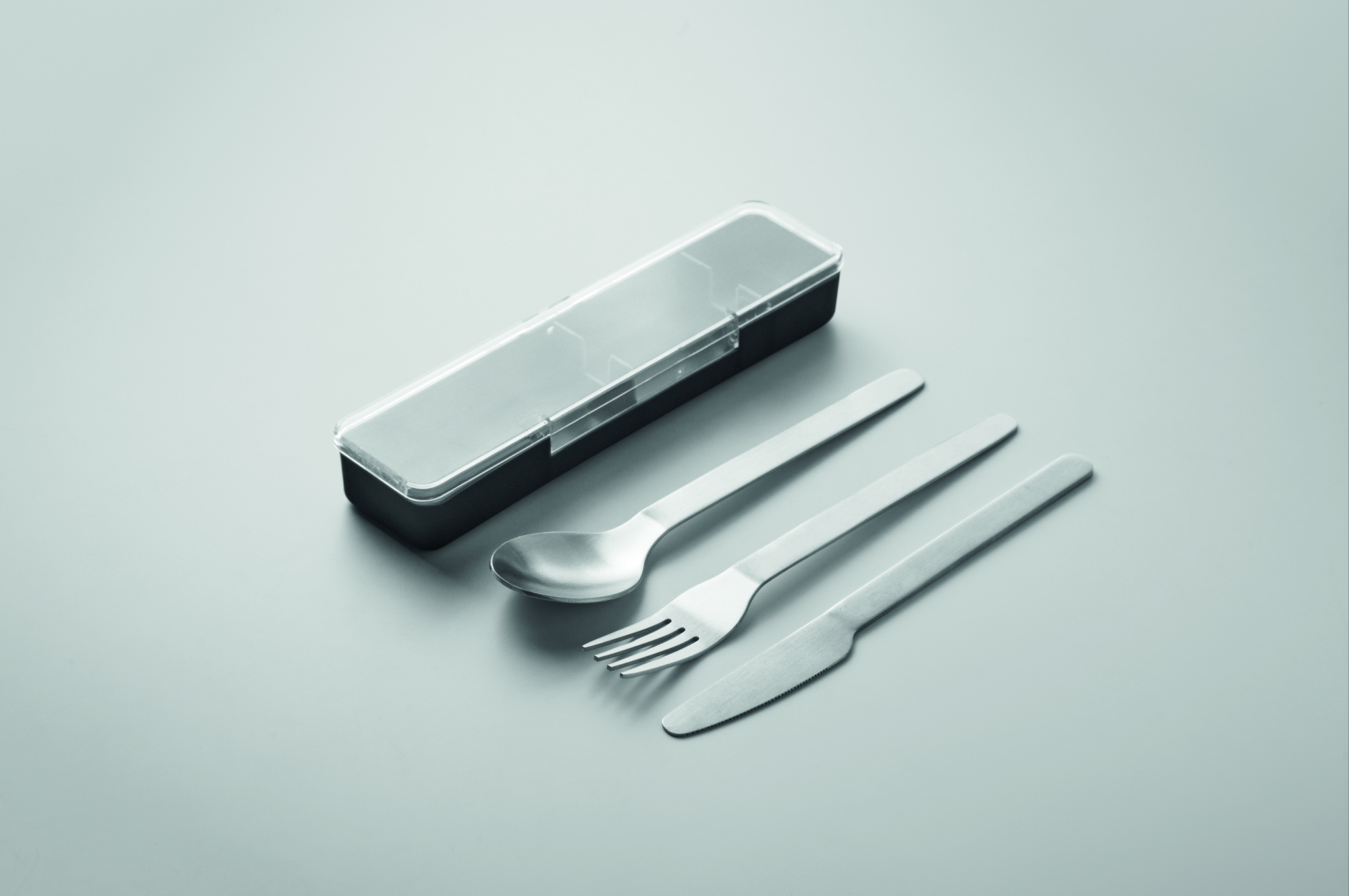 Roostevabast terasest söögiriistade komplekt PP-ümbrisega. Komplekt sisaldab kahvlit, nuga ja lusikat.