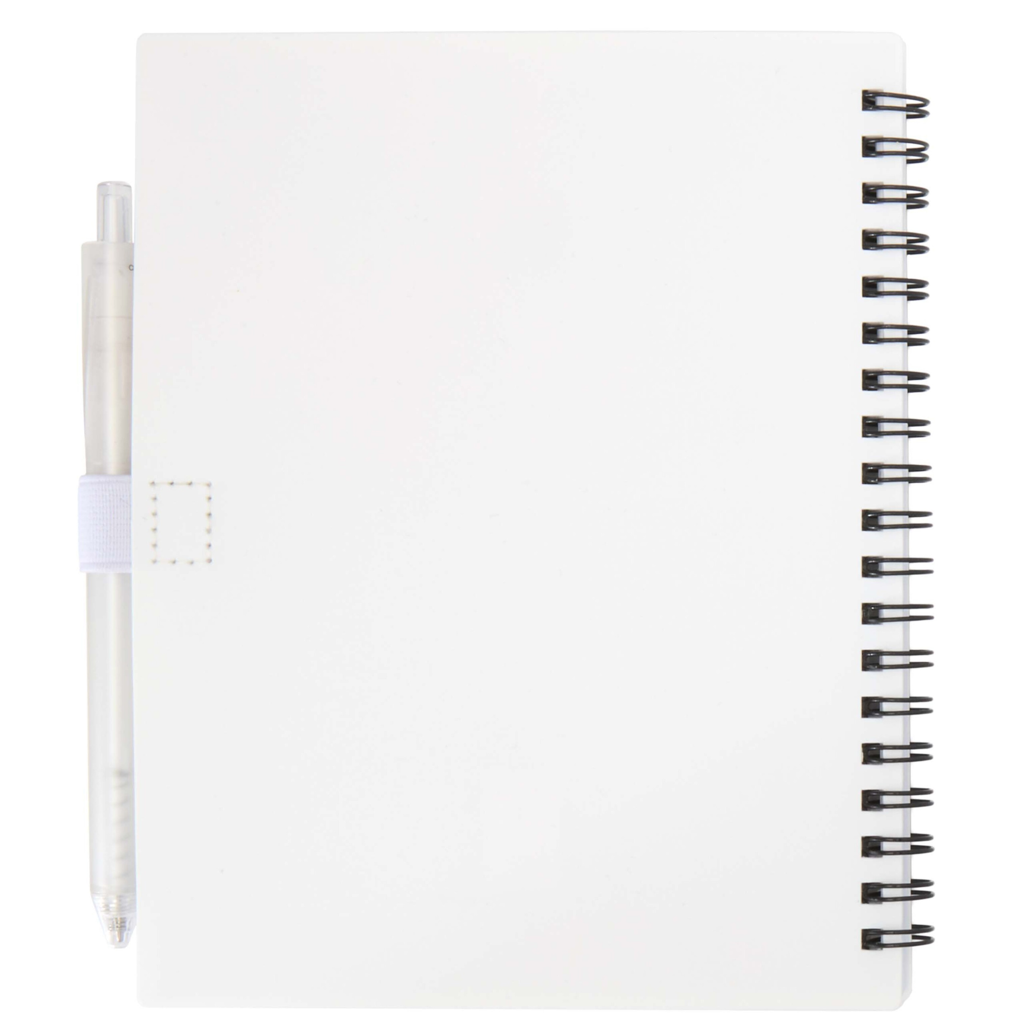Niove pehmekaaneline märkmik on valmistatud taaskasutatud plastist ja sisaldab 70 punktiirjoontega lehte (70 g/m² paberit). Märkmikul on pliiatsiaas. Märkmiku suurus: 140 x 178 mm. Pastapliiats on samuti valmistatud taaskasutatud plastist. Tindi värv: sinine. Kirjutuspikkus: 1000 meetrit. Otsa suurus: 1,0 mm.
