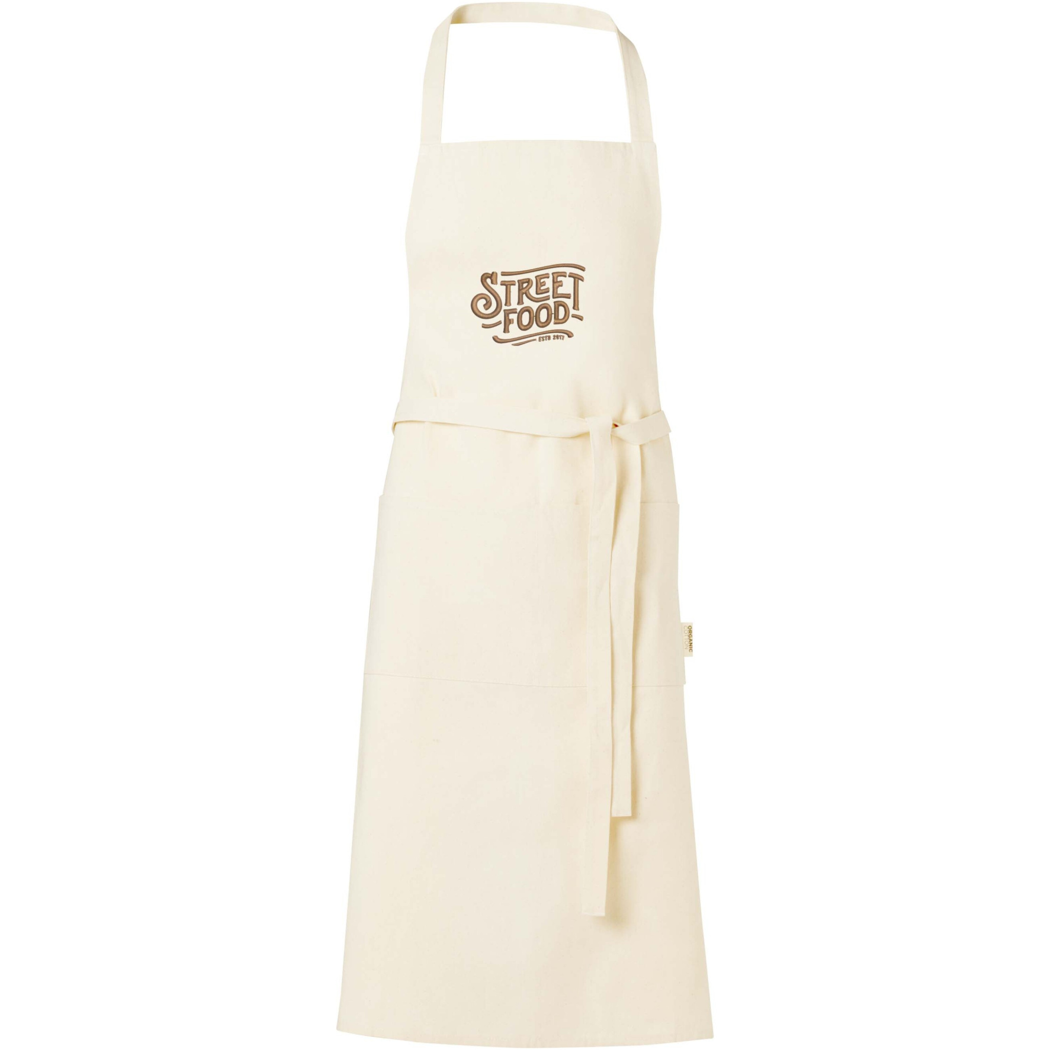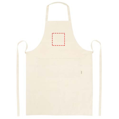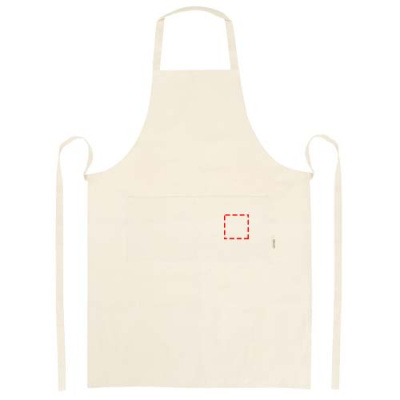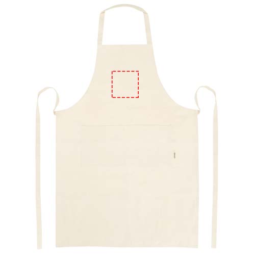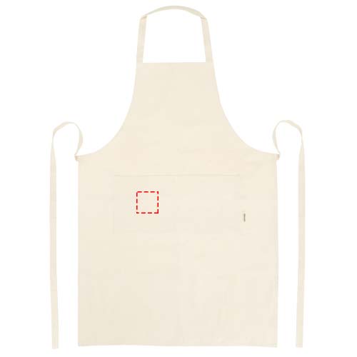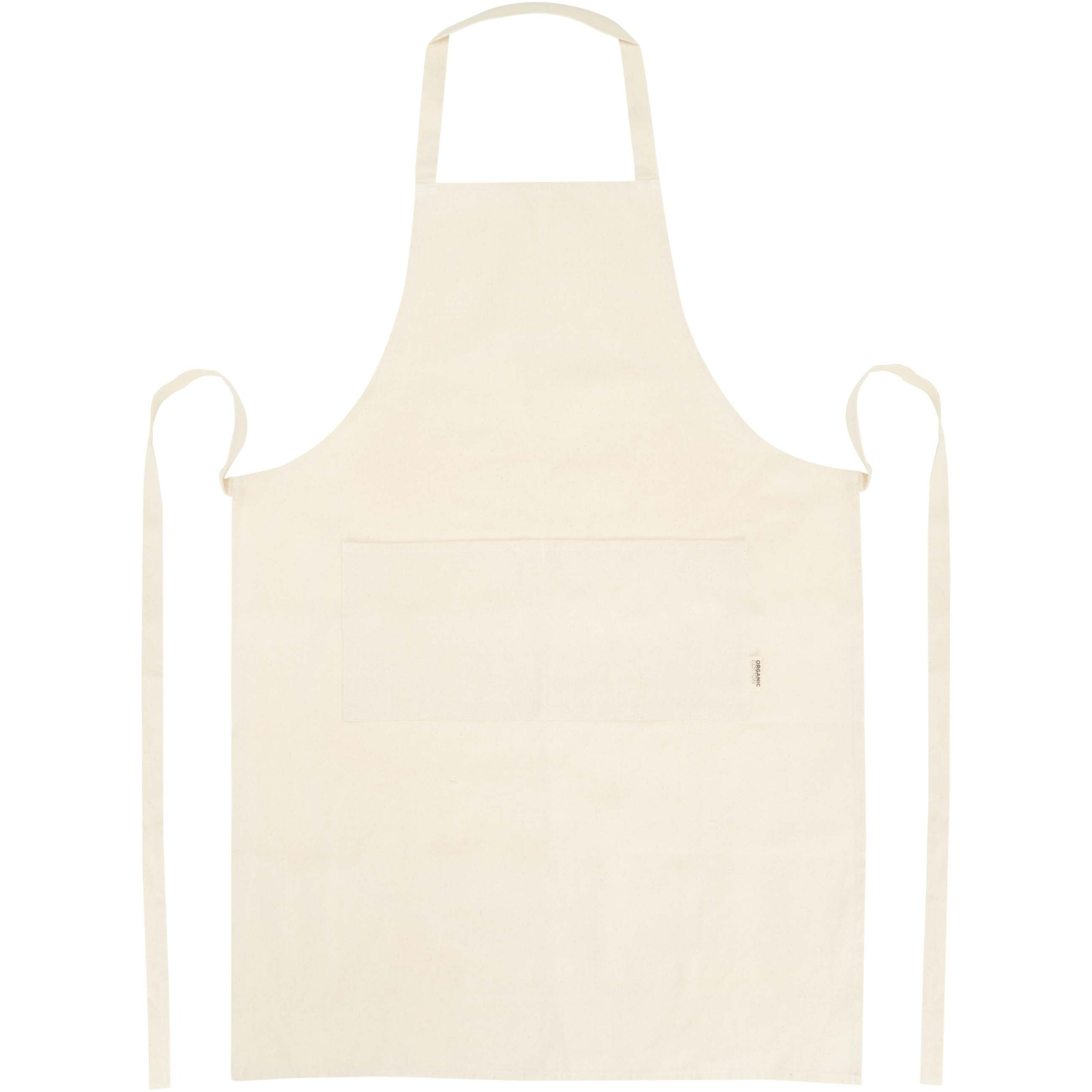 100% OCS-sertifitseeritud 200 g/m² India päritolu orgaanilisest puuvillast põll, millel on kaks kõrvuti asetsevat taskut suurusega 45 x 20 cm ja 1-meetrine seotav kinnitus. Kaelarihma pikkus: 55 cm.