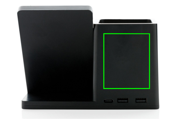 10 W kiire juhtmevaba laadija koos pliiatsihoidjaga, mis on valmistatud RCS (Recycled Claim Standard) sertifitseeritud taaskasutatud ABS-ist. Taaskasutatud kogusisaldus: 78% eseme kogukaalust. RCS-sertifikaat tagab taaskasutatud materjalide täielikult sertifitseeritud tarneahela. Bambusest FSC 100 bambusest valmistatud juhtmevaba laadimisala. Kahe USB-pordiga tagaküljel laadimiseks kaabli kaudu. Juhtmeta laadimine ühildub Androidi uusimate põlvkondade, iPhone 8 ja uuemate versioonidega. Toode ja tarvikud PVC-vaba. Kaasa arvatud 120 cm C-tüüpi laadimiskaabel, mis on valmistatud RCS-sertifikaadiga taaskasutatud TPE-st. Pakitud FSC mix kraft karpi. Type-C sisend 5V/2A; 9V/2A; Juhtmeta väljund 5V/1A;9V/1,1A; (10W) Registreeritud disain®