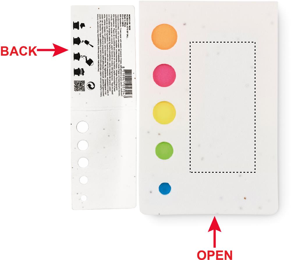 Kleepuva lehemarkeri padi 5 erinevat värvi ja pehme seemnepaberi kate. Kui olete oma mõtted viimasele lehele salvestanud, istutage kate ja vaadake, kuidas see kauniks punaste moonide väljaks kasvab.