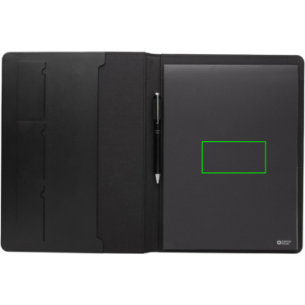 100% AWARE 300D taaskasutatud polüestrist ja RCS-sertifikaadiga taaskasutatud PU-st valmistatud portfell ühendab stiili ja vähese mõju. Sellel on visiitkaardipesad, pliiatsi aas ja mahukas A4-formaadis tasku. Püsige organiseeritud korduvtäidetava A4 vooderdatud märkmikuga (20 lehekülge 70 g/m²), mis on valmistatud FSC® mix-kreemipaberist. Kogege rafineeritust südametunnistusega. Valmistatud 100% taaskasutatud polüestrist, millele on lisatud AWARE™ märgistus. Pakitud FSC® kinkekarpi.