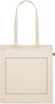 140 gr/m² kierrätetystä puuvillasta valmistettu kassi (65 % kierrätettyä puuvillaa, 35 % tavallista puuvillaa), pitkillä kahvoilla.
