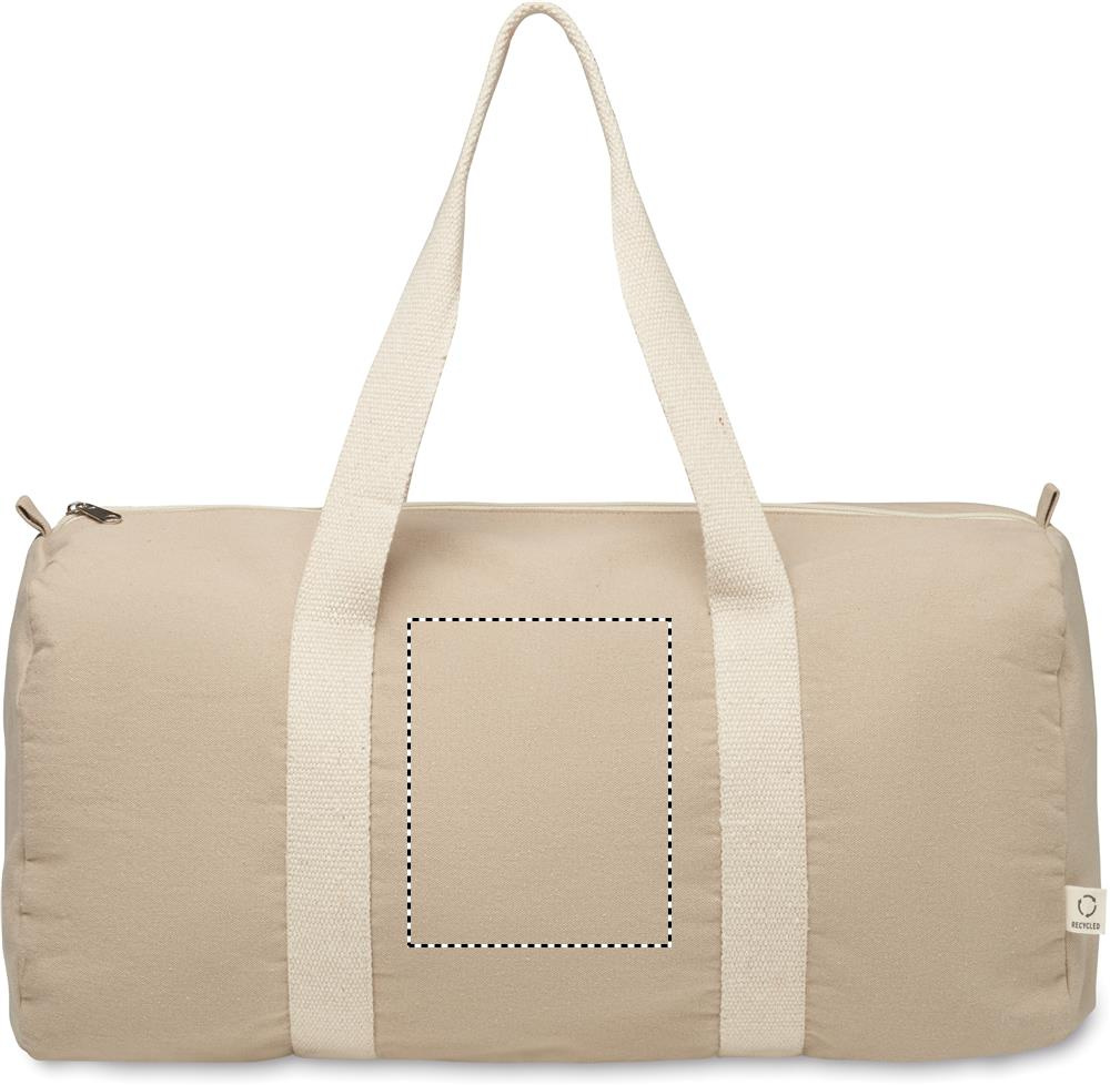 Duffle-, urheilu- tai matkalaukku, jossa on vetoketjullinen sivutasku ja vetoketjullinen sisätasku 320 g/m² kierrätyspuuvillaa (80 %) ja kierrätettyä polyesteriä (20 %) pitkällä kahvalla.