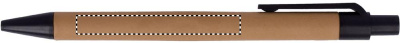 Muistikirja pehmeällä korkki kannella, 140 viivoitettua sivua (70 arkkia) ja kierrätetty kuulakärkikynä mustalla musteella. Kynän runko on valmistettu kierrätetystä kartongista, yksityiskohdat valmistettu maissi PLA. Korkki on luonnonmateriaali, strukturaalinen laatu ja pinnan huokoisuus voi aiheuttaa eroavaisuuksia tuotteissa painatuksen jälkeen
