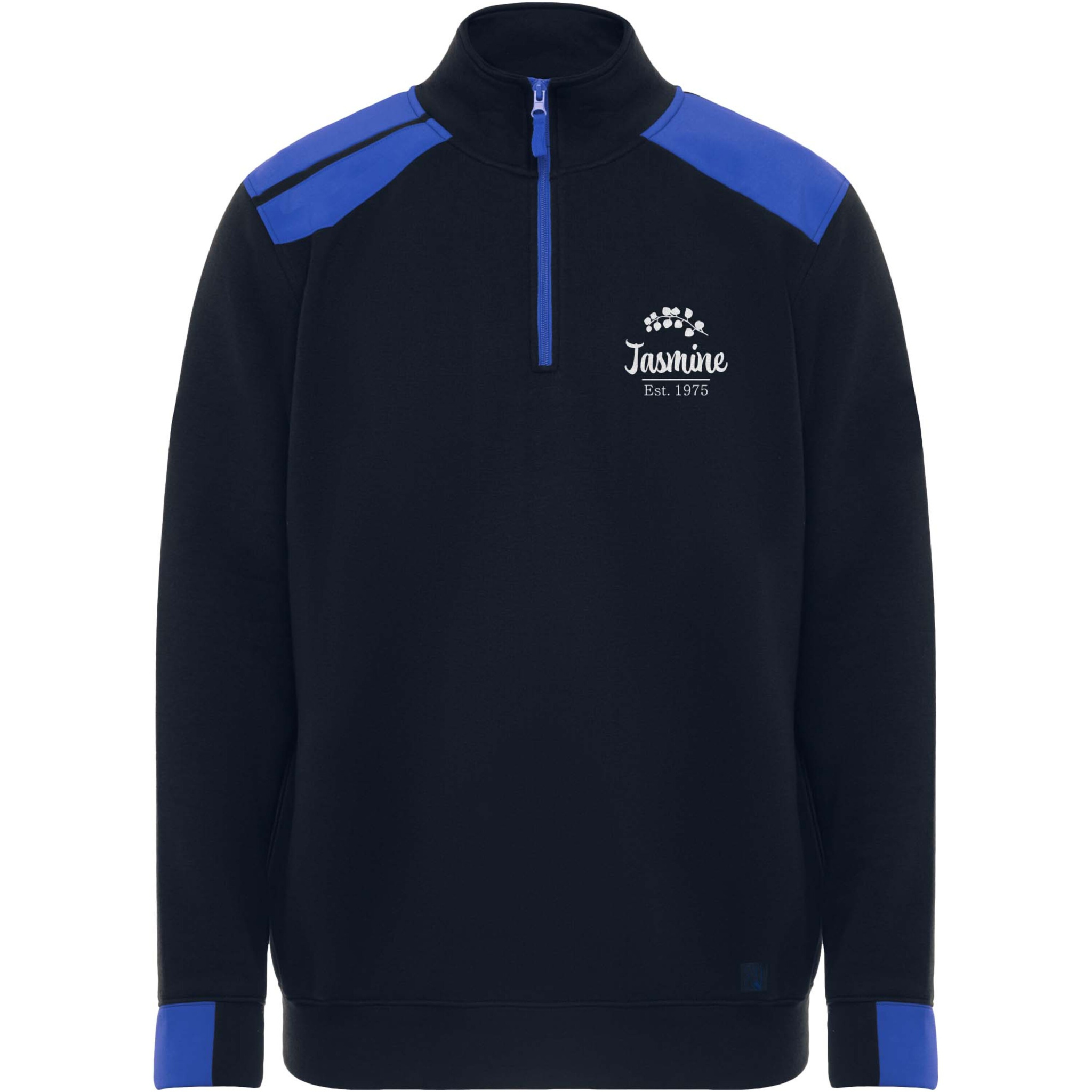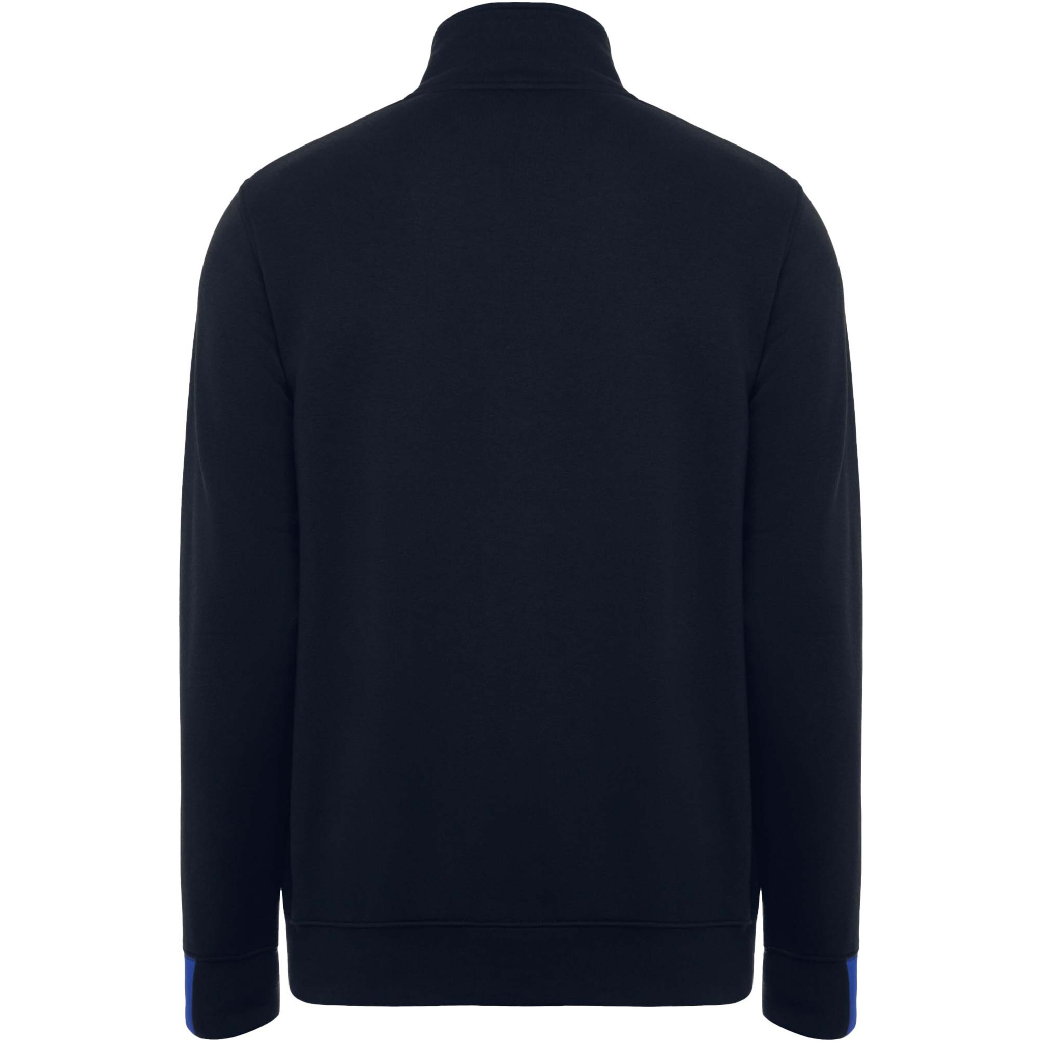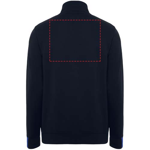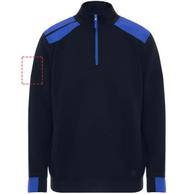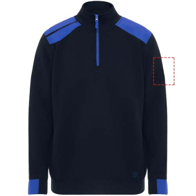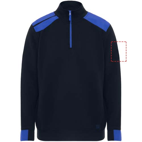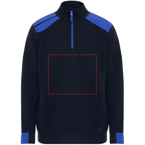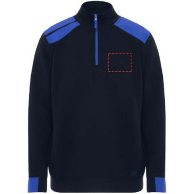 Puolivetoketjullinen svetari väriyhdistelmällä ja korkealla kauluksella. Kauluksen sisäpuolella vahvistetut koristesaumat. Kontrastiväriset olkapäät ja yksityiskohdat. Lyhyet hihat ja helma 1x1-resorikangasta.