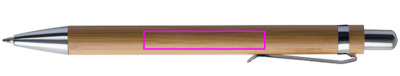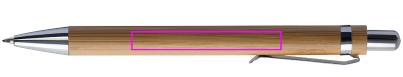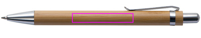 Bambusta valmistettu kuulakärkikynä, jossa sininen kirjoitus suuri täyttö. Viimeistely tehdään laserkaiverruksella klipsien alle.