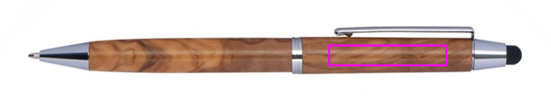 Oliivipuusta valmistettu kuulakärkikynä, kosketustoiminto ja sininen kirjoitustäyttö. Logosi kaiverretaan klipin alle.