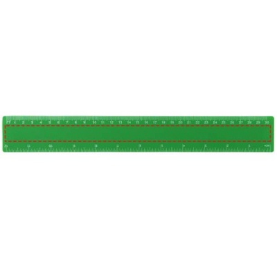Joustava kevyt muovinen viivain, johon on merkitty tuumat ja senttimetrit.