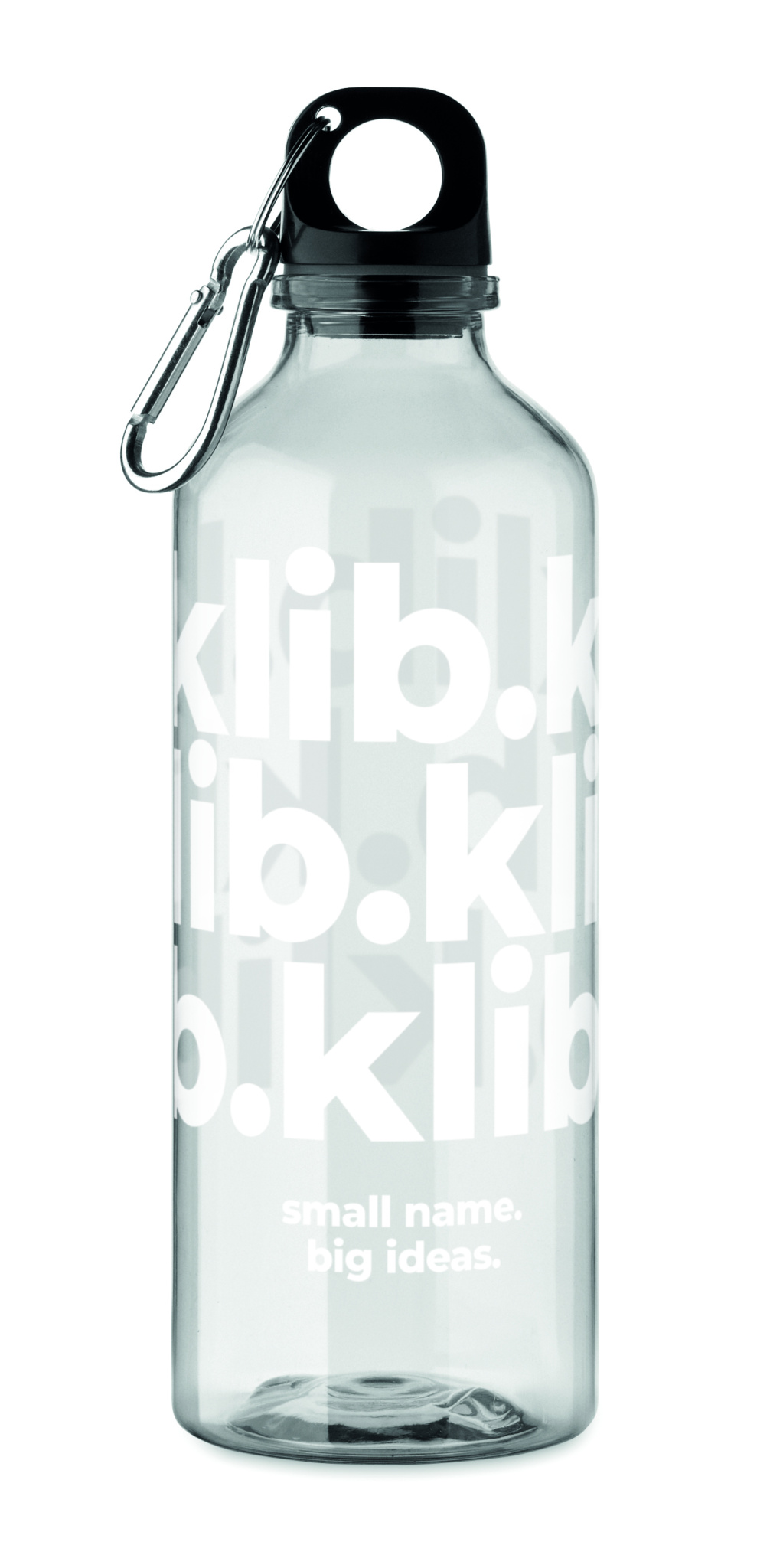 Juomapullo RPET-muovia, jossa karbiinihaka. Tilavuus: 500 ml.