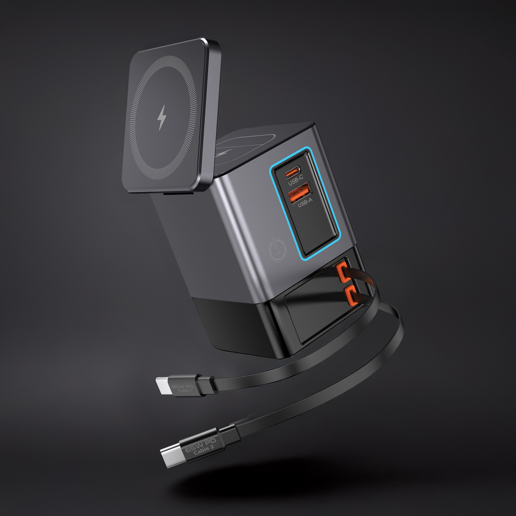 All in one-virtalähde, jota olet odottanut. Sacramento on 105 W:n GaN-latausasema, jossa yhdistyvät maksimaalinen teho ja sisäänrakennettu kätevyys. Siinä on kaksi integroitua, sisäänvedettävää 65 W:n USB-C-kaapelia, joten nopea lataus on aina käden ulottuvilla – ylimääräisiä kaapeleita ei tarvita. Tarvitsetko lisää vaihtoehtoja? Sacramento sisältää myös USB-A- ja USB-C-portin, joten sinulla on yhteensä neljä lähtöliitäntää kannettavien tietokoneiden, tablettien, älypuhelinten ja muiden laitteiden lataamiseen – kaikki samanaikaisesti. Langattomille laitteille Sacramento on varustettu tehokkaalla 15 W:n magneettisella langattomalla laturilla, joka pitää puhelimesi turvallisesti paikallaan, sekä erillisellä langattomalla alustalla, joka on suunniteltu erityisesti pienemmille laitteille, kuten kuulokkeille tai AirPodseille (maks. 5 W). Sacramento tarjoaa korkean suorituskyvyn kompaktilla ja tehokkaalla muotoilulla – se tuottaa vähemmän lämpöä ja käyttää energiaa tehokkaammin.