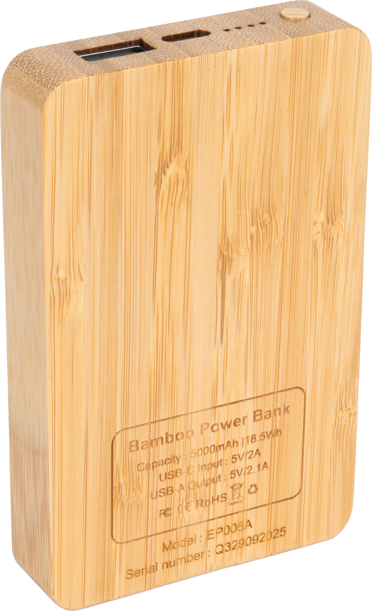 Tämä 5000 mAh:n bambusta valmistettu varavirtalähde yhdistää luonnollisen estetiikan moderniin toiminnallisuuteen. Kaiverrettu logo syttyy, kun laite aktivoidaan, mikä lisää tyylikkään ja erottuvan visuaalisen ilmeen. Neljä LED-merkkivaloa näyttävät akun varaustason, kun taas USB-C-tulo/lähtö (5V/2A) ja USB-lähtö (5V/2A) tarjoavat nopean ja luotettavan latauksen. Mukana tulee USB-C-kaapeli, joten varavirtalähde on käyttövalmis suoraan pakkauksesta.