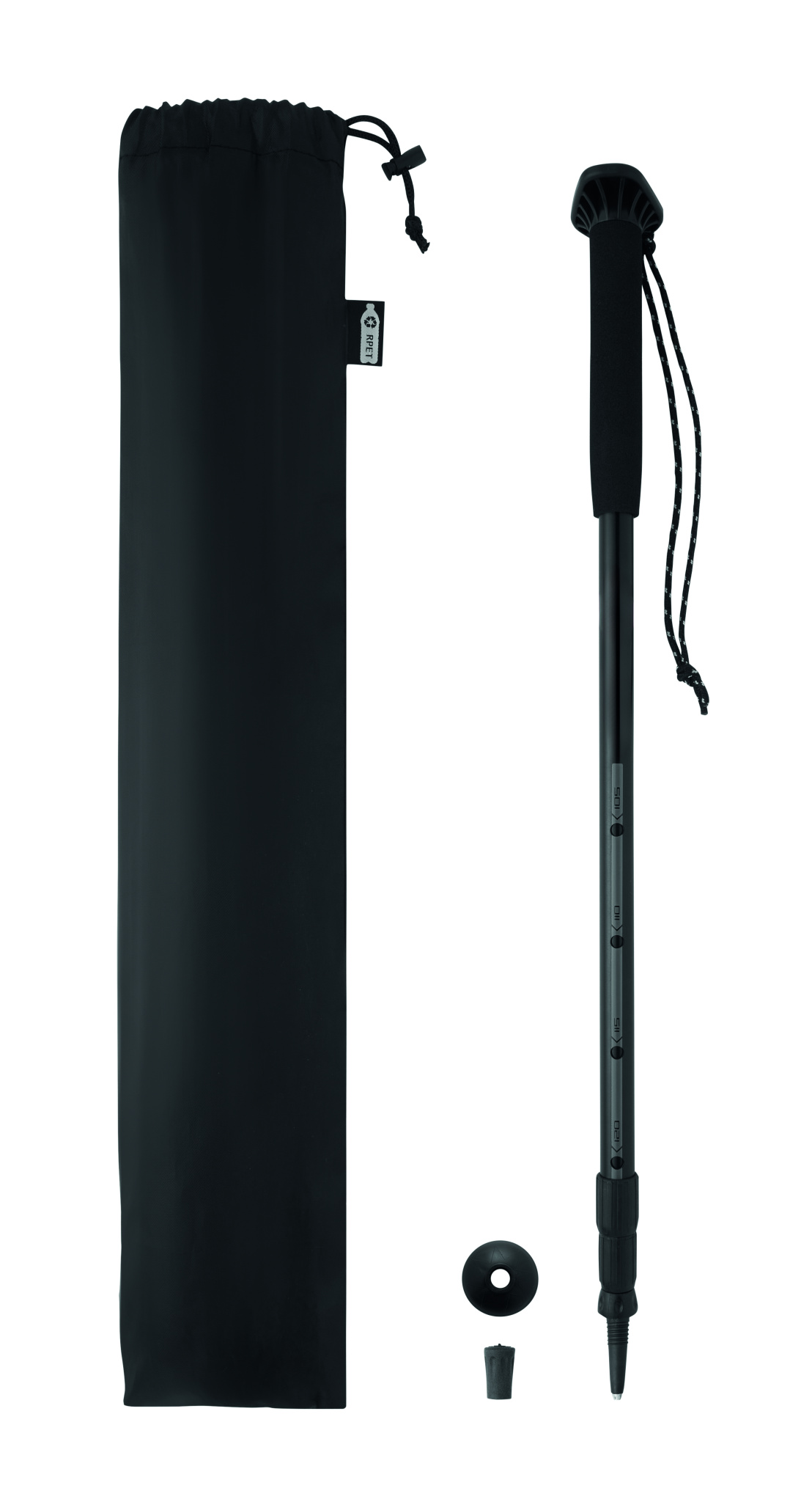 Teleskopinė lazda su EVA rankena, riešo dirželiu, guminiu antgaliu ir purvo krepšeliu. Reguliuojamas ilgis nuo 105 iki 120 cm. Supakuota RPET raišteliu užtraukiamame maišelyje. Lengva ir patvari konstrukcija.