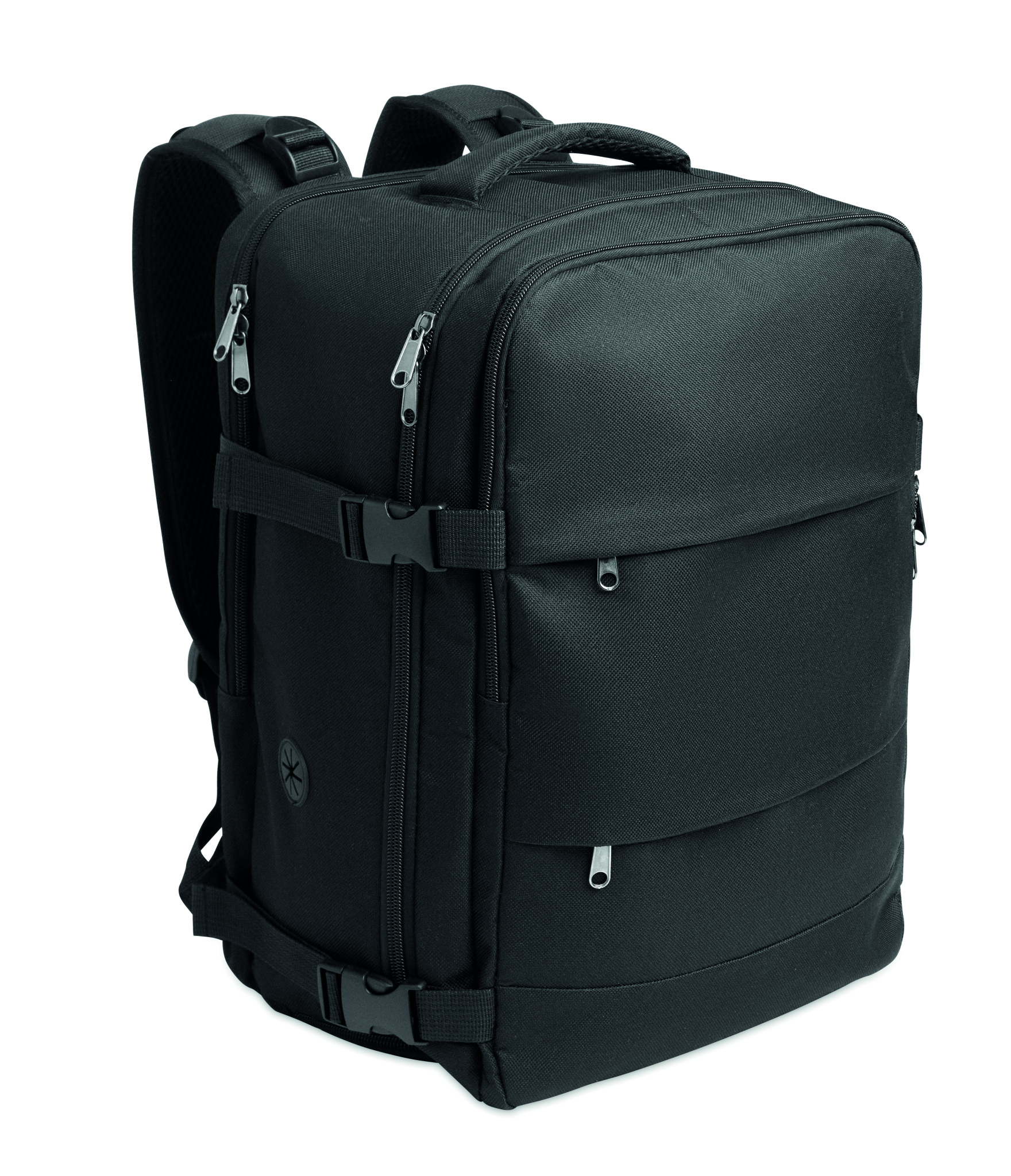 Salona izmēra pagarināma mugursoma no 600D RPET poliestera ar PU pamatni un 180o atvērumu. Iekļauts nodalījums apaviem, polsterēta 15 collu klēpjdatora kabata, sieta siksnas, bagāžas siksna un sānu sprādzes.