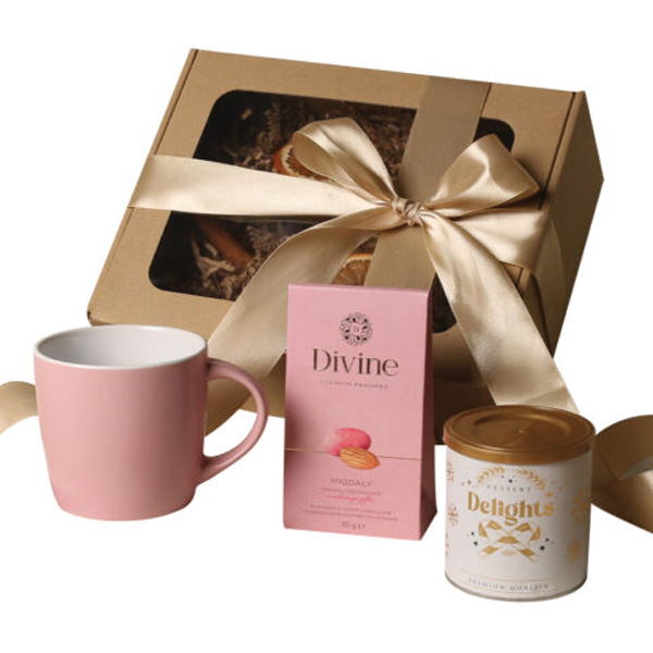 В набор входят: кружка Handy Velvet розово-белого / нежно-голубо-белого / Handy Cool серо-белого цветов с возможностью персонализации, конфеты пралине – миндаль в шоколаде с малиновой пудрой (розовый) / миндаль в шоколаде с кокосом (синий) / апельсиновая цедра в тёмном шоколаде (серый), десерт Delights – чёрная смородина в белом шоколаде с малиновой пудрой, упакованный в тубус с зимней тематикой. Всё упаковано в стильную коробку из эко-картона с окошком. Дополнительные возможности персонализации: печать на кружке, бирка с логотипом компании, лента или чехол с зимней тематикой, украшенный золотым тиснением.