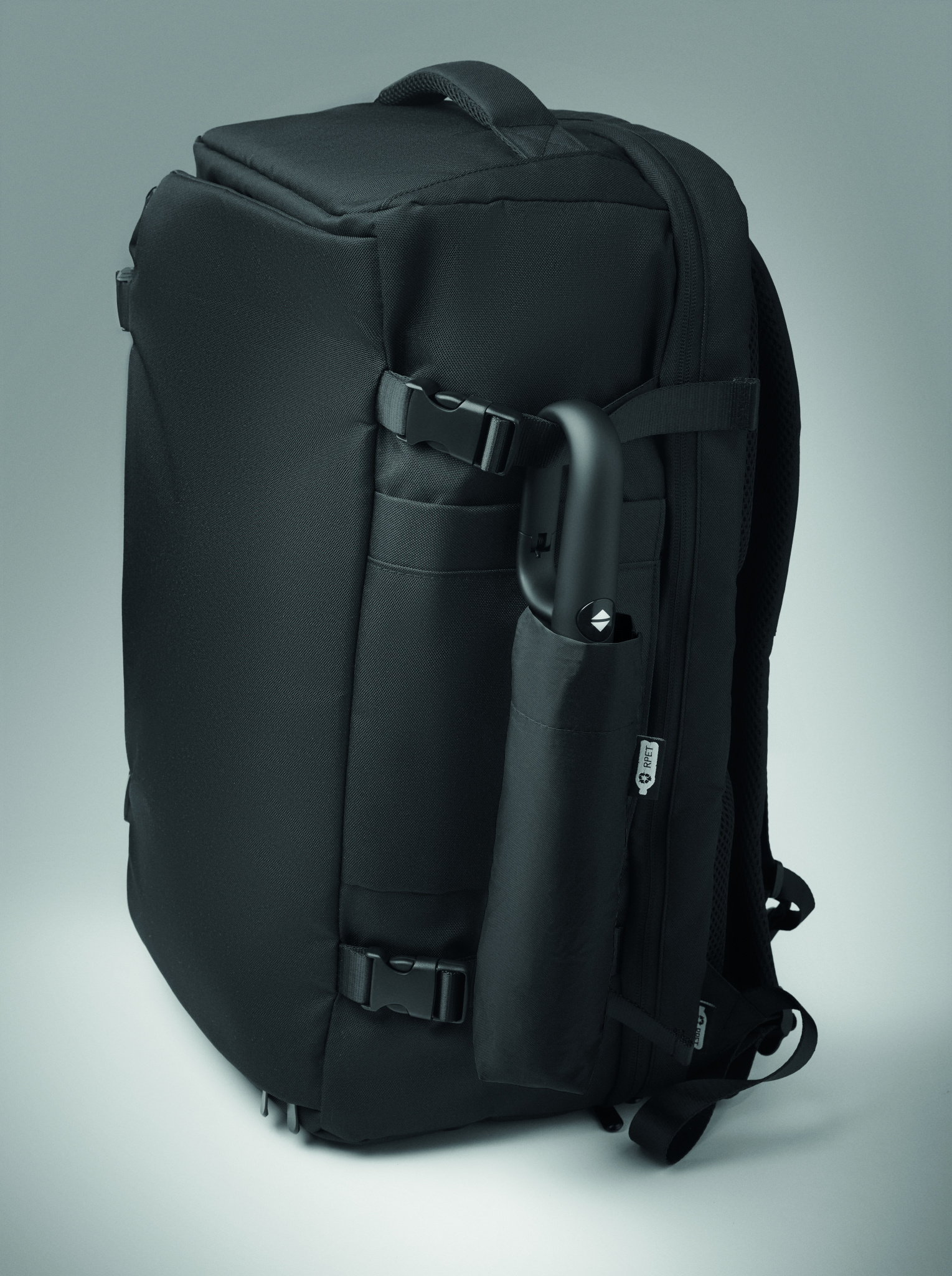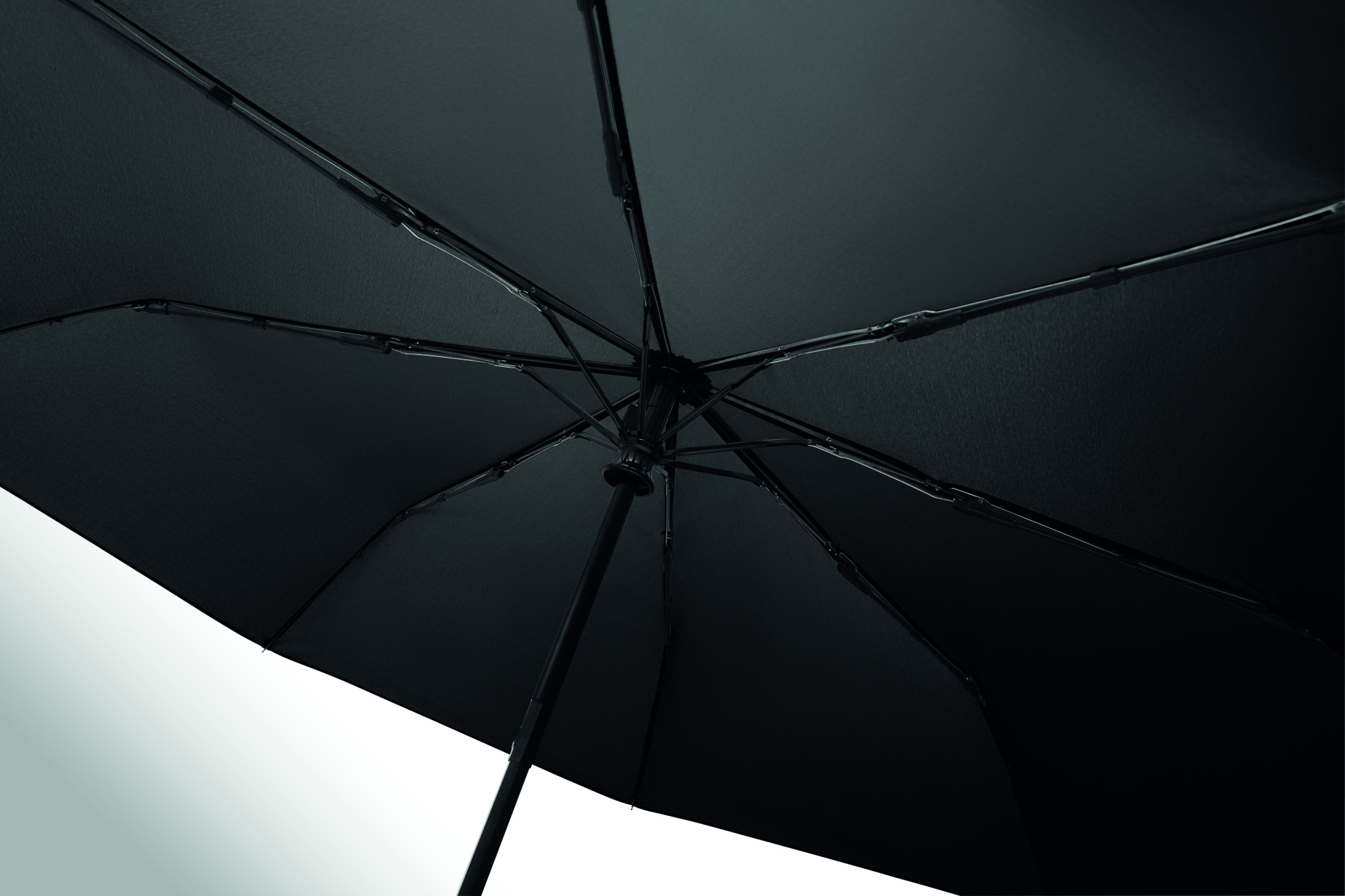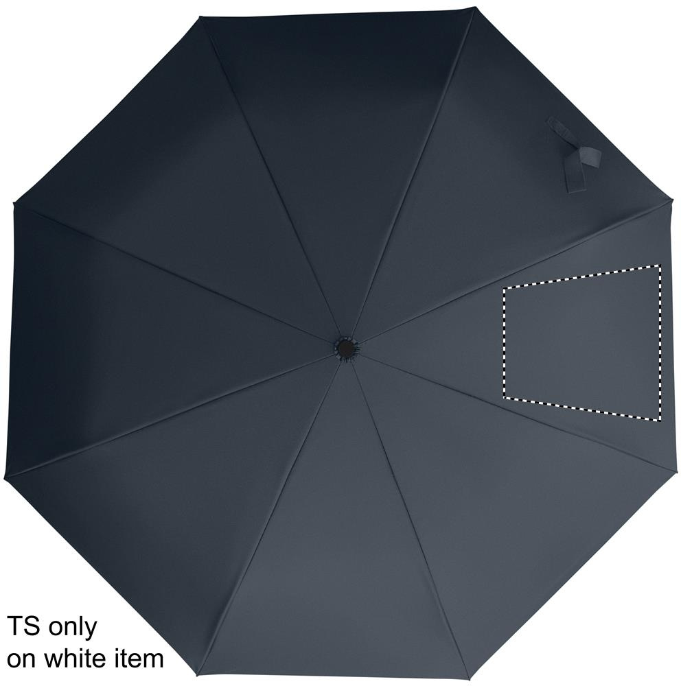 Foldable 21'' windproof umbrella with full black plating fibreglass frame with 2 sections. Fibreglass ribs. 190T RPET pongee panels. D shape carabiner handle w/ rubber finish. Auto open and closure. Includes pouch
