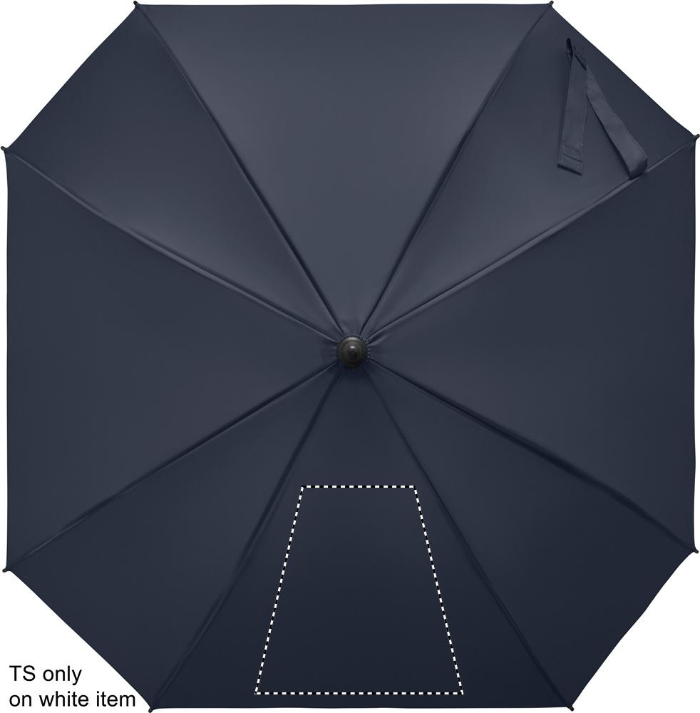 23-inch windproof auto-open square umbrella in 190T pongee polyester. Features full fibreglass frame and ribs, rubber-finished ABS handle.