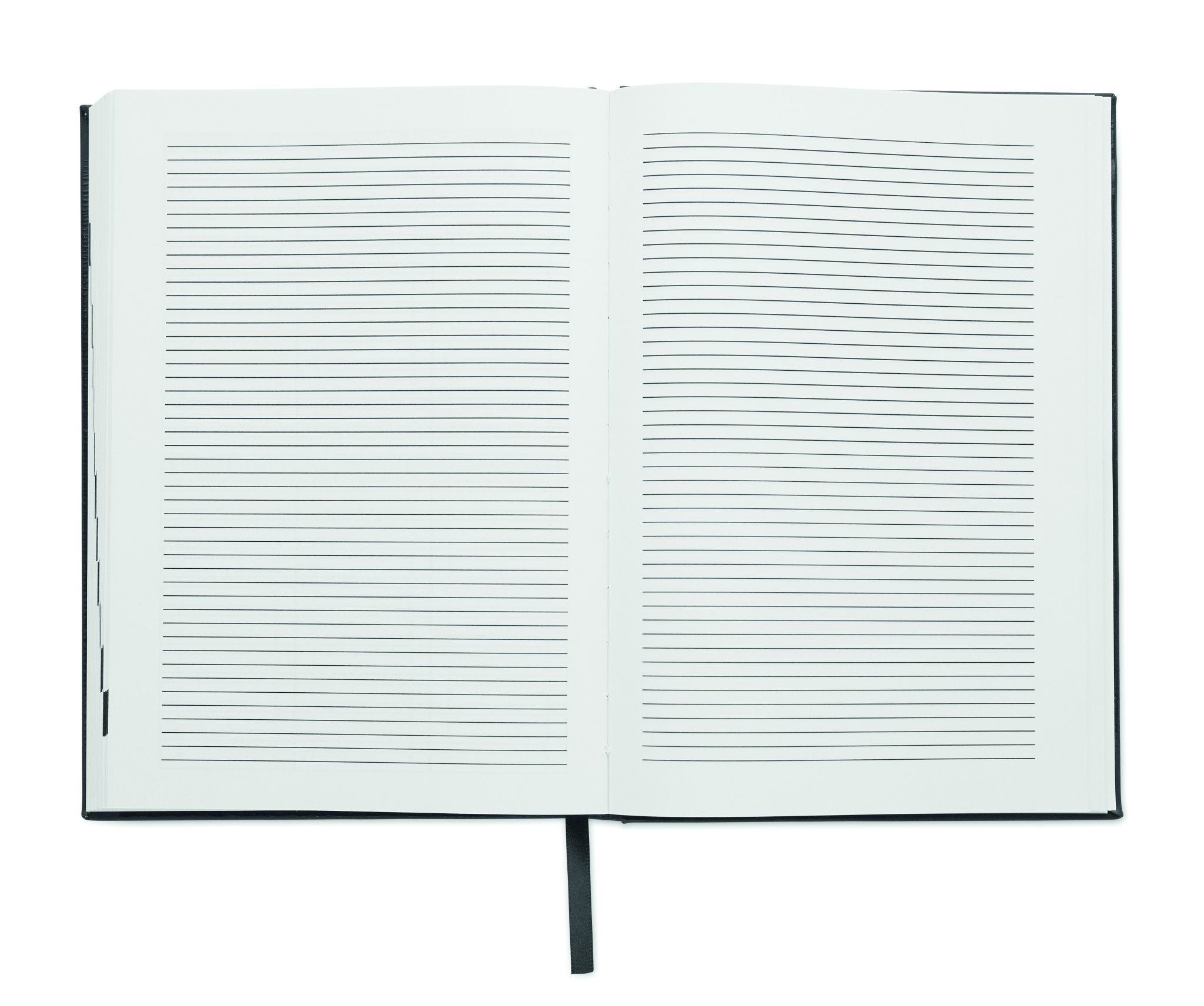 A5 daily diary notebook in 60% recycled post consumer polyester and 40% PU cover. 416 universal pages in 70gsm recycled paper (208 sheets). With matching colour polyester ribbon page marker.